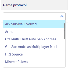 Alle unterstützten Protokolle der Game DDoS Protection für einen bestimmten Server sind auf der Konfigurationsseite GAME Firewall für jede IP-Adresse, die auf diesen Server verweist, im Dropdown-Menü Game Protocol zu sehen: