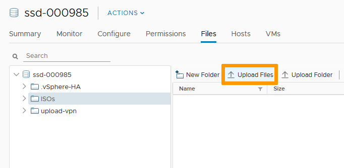 You can refer to the guide Upload an ISO to a datastore for more information on uploading elements (ISO, files, etc.) to your VMware on OVHcloud environment.