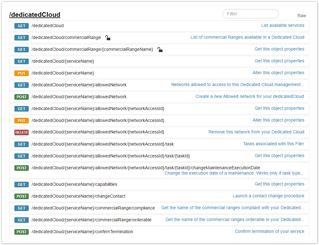 Cliquez sur la partie /dedicatedCloud/ Vous trouverez différents appels possibles (GET, PUT, POST, DELETE).