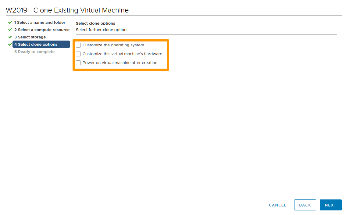 Select the options for your clone VM.