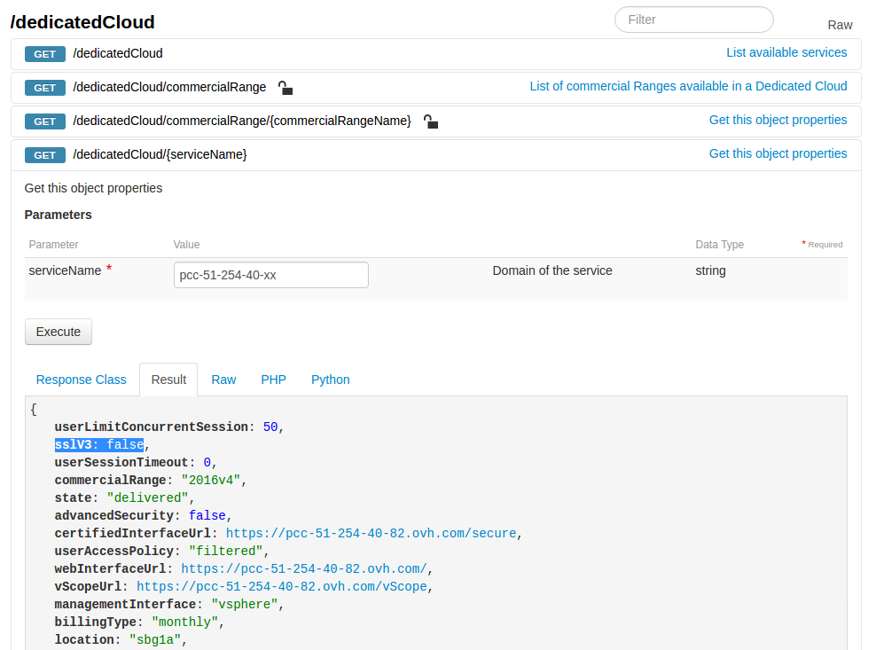 La réponse de l'api vous indique un ensemble d'informations concernant votre infrastructure. Repérez la ligne SSLv3 pour connaitre l'état de l'option SSLv3 (true pour activée, false pour désactivée).