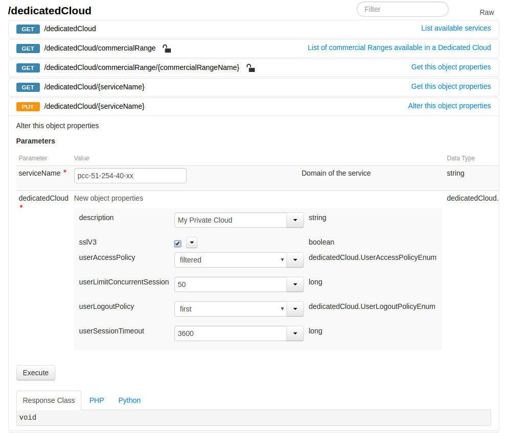 Dans la section /dedicatedCloud, repérez l'appel PUT /dedicatedCloud/{serviceName}