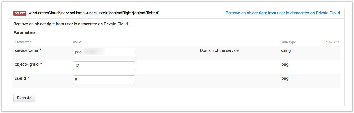 Fill in the fields with the objectRightId corresponding to the right you want to remove.