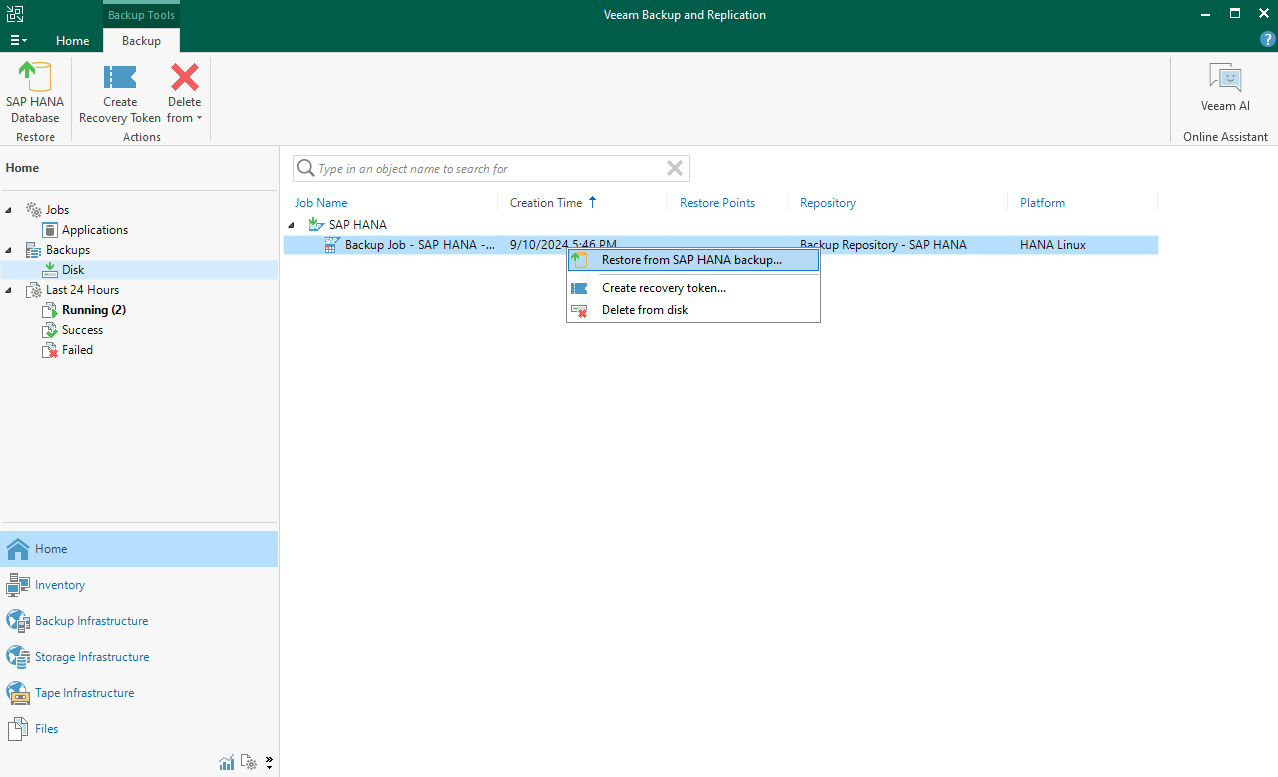 Ouvrez la console Veeam Backup and Replication, sélectionnez Home, Backups, Disk, puis cliquez sur Restore from SAP HANA backups... en faisant un clic droit sur la sauvegarde de votre base de données SAP HANA.
