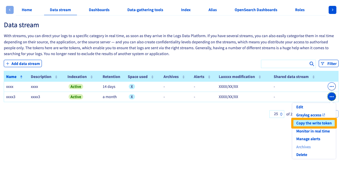 X-OVH-TOKEN: the X-OVH-token is used to dispatch the logs you ingest into Logs Data Platform to the correct log stream. You can find the X-OVH-TOKEN corresponding to your stream in the in the Data stream section of the OVHcloud Control Panel.