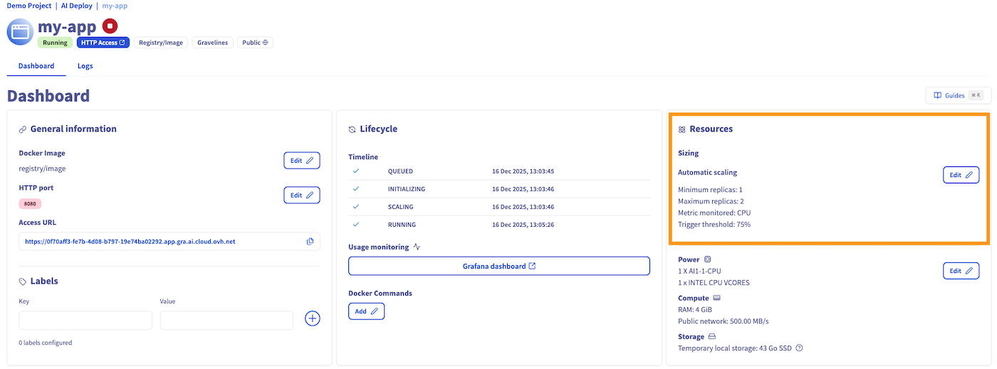 To modify scaling strategies through the UI, navigate to your application details page by clicking on its name in the AI Deploy section. On this page, you will find general information about your application, including a Resources section.