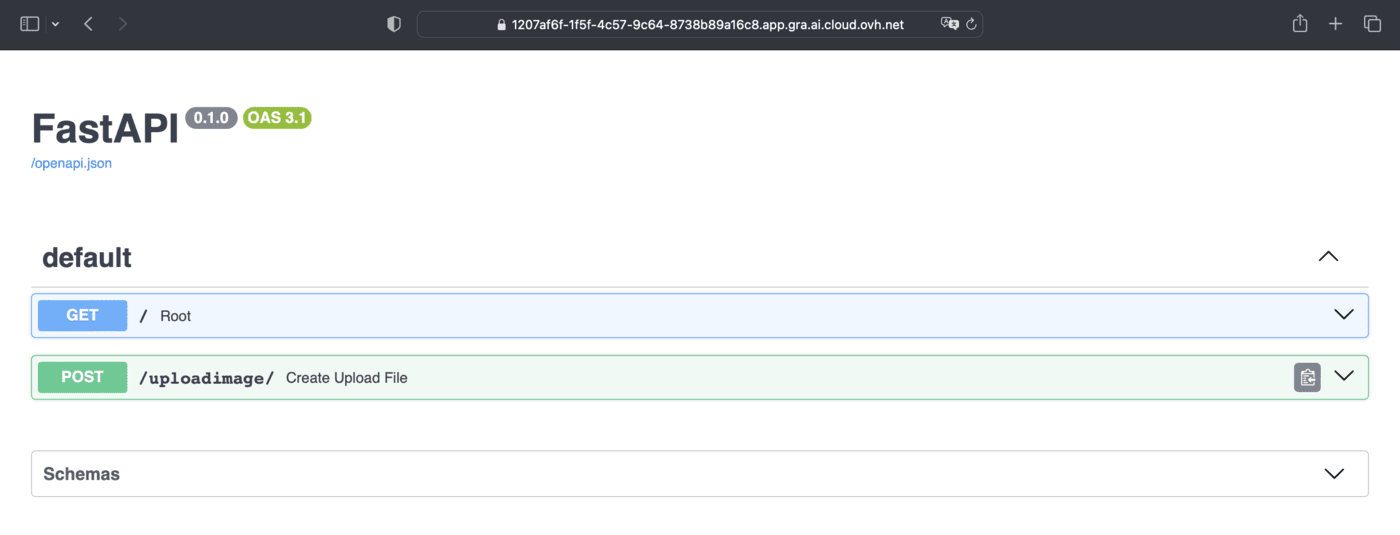 In our example, the URL is as follows: https://1207af6f-1f5f-4c57-9c64-8738b89a16c8.app.gra.ai.cloud.ovh.net/docs