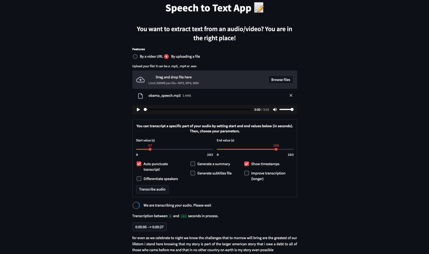 The purpose of this documentation is to Deploy the Speech to Text Application we have realised in our blog article using Streamlit and pre-trained models.