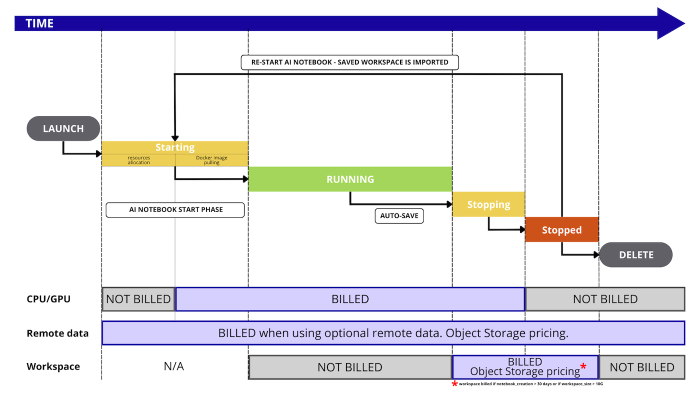 In situations where you are utilizing notebooks with attached remote data, you will be charged separately for the storage of this data. The cost of Object Storage is independent of the pricing for notebooks.