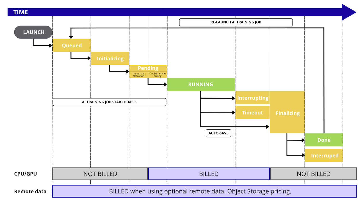 The OVHcloud AI Training service provides you a container as a service platform, linked to CPU or GPU resources, without the hassle of installing or operating them. This guide will cover the lifecycle of an AI Training job, and associated billing.