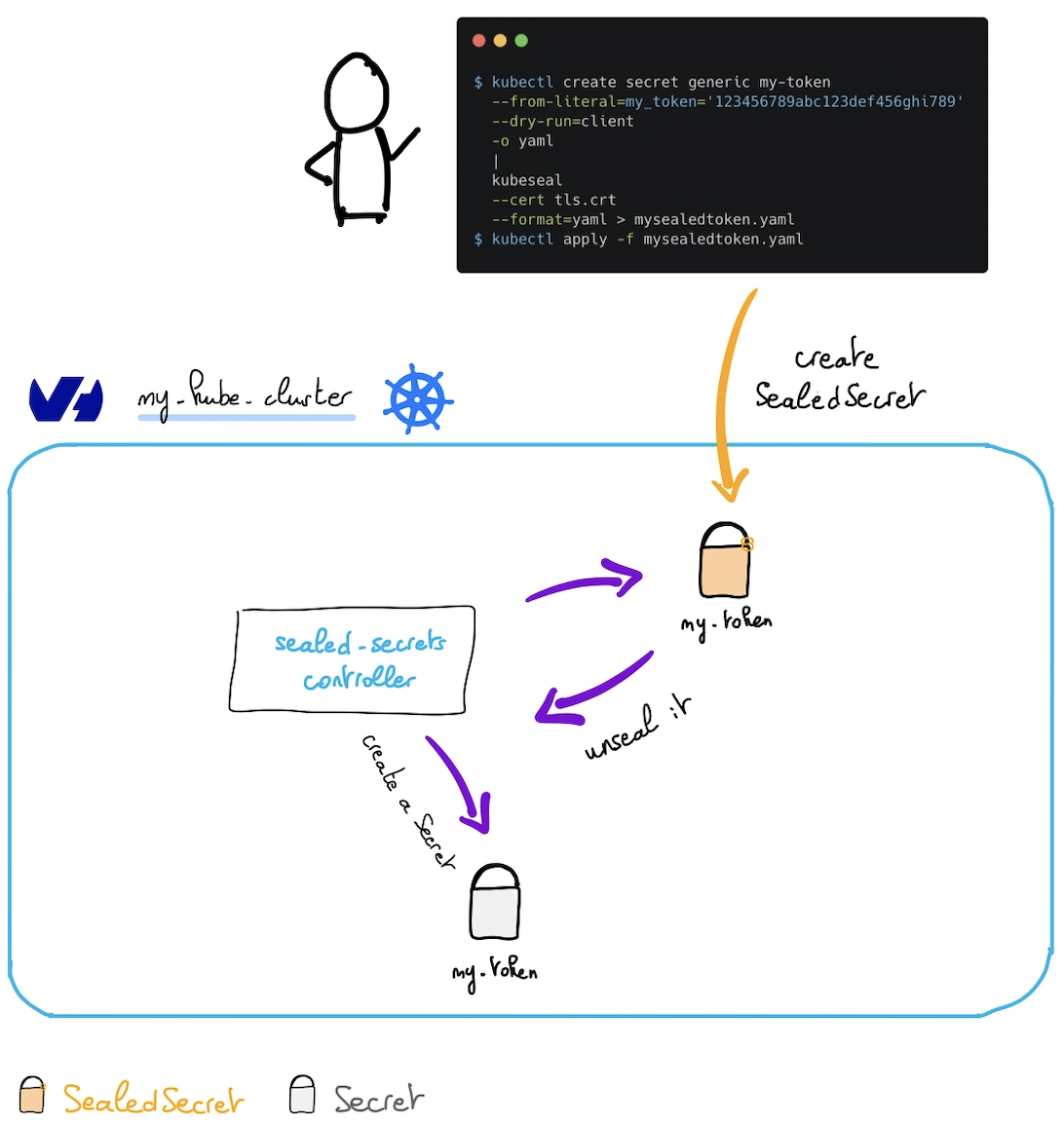 As you can see in the schema, a sealed-secrets-controller runs in the Kubernetes cluster. He listens when a new SealedSecret object appears, unseals it (thanks to known certificates) and creates a Kubernetes secret in the same namespace as the SealedSecret.