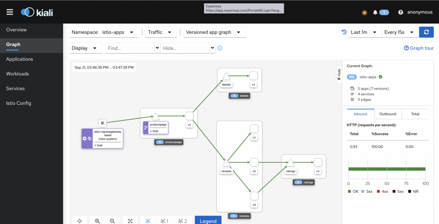 Now, we will take a look to the traffic. For that, in the left navigation menu, select Graph and in the Namespace drop down, select istio-apps.