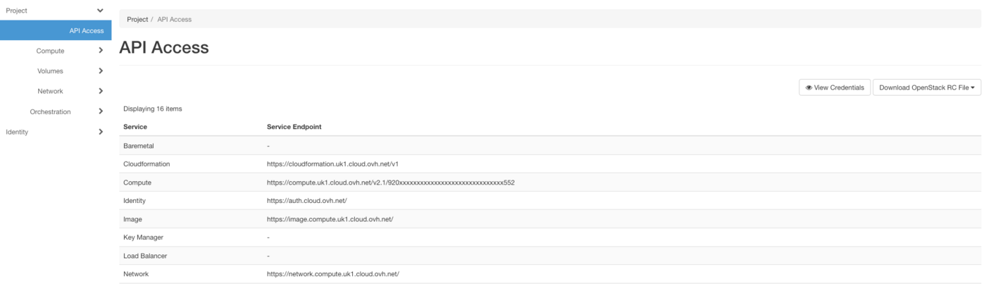 Die Tabelle unter "API Access" listet die Service-Endpunkte der OpenStack API auf.