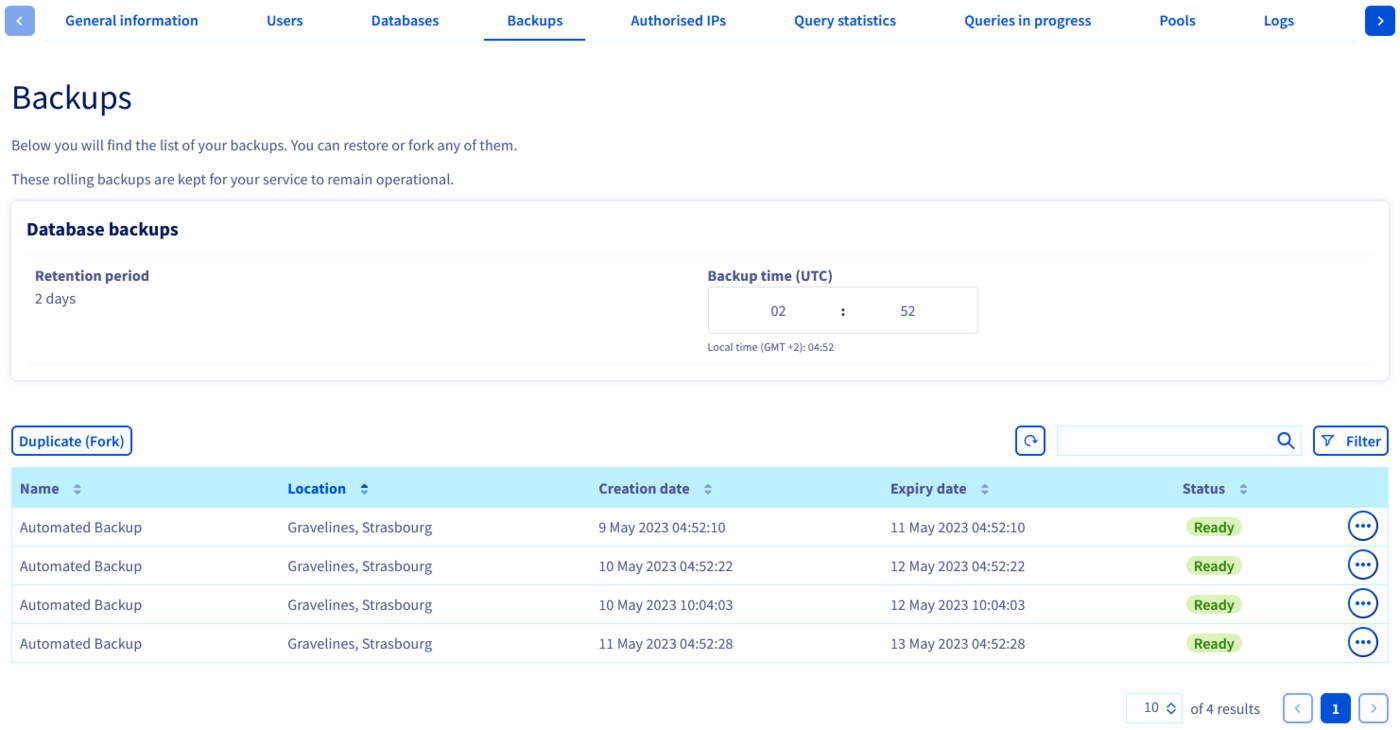 Click on the ... button corresponding to the chosen backup. Then click on Duplicate (Fork) to go to the configuration page of the new service.