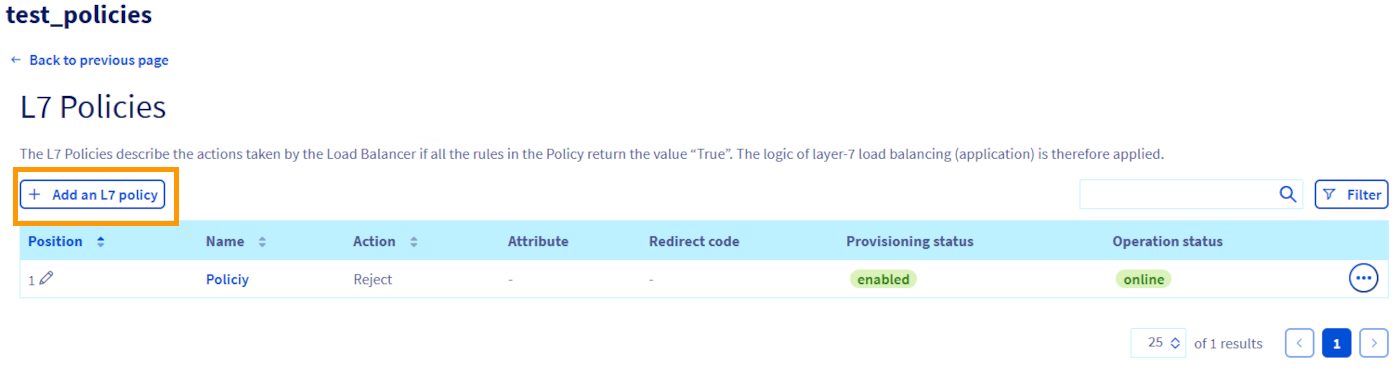 Once in the L7 policies section, you can view existing policies or click on Add an L7 policy to create a new policy, depending on the options available in the interface.