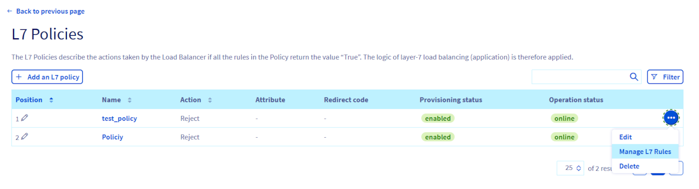 To access the management options for L7 policies of a specific listener, click the ... button to the right of the listener you want to configure.
