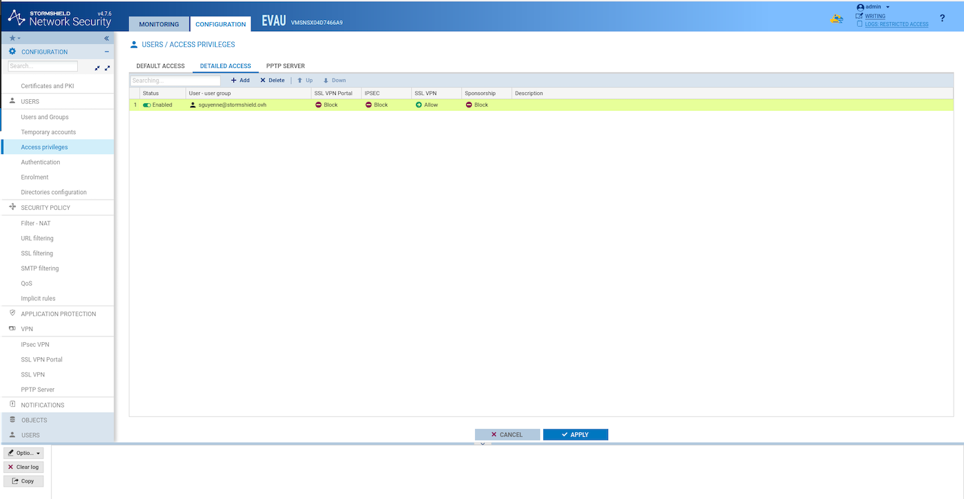 Fügen Sie Ihrem Benutzer die Berechtigung zur Verwendung des SSL VPN Servers hinzu (Configuration > Users > Access privileges > Detailed Access > Add).