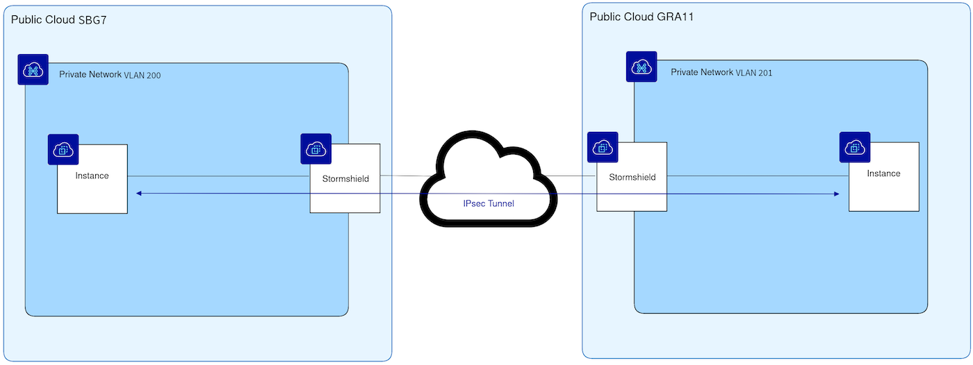 In diesem Beispiel ist der IPsec-Tunnel so konfiguriert, dass zwei verschiedene PCI-Regionen miteinander verbunden werden: SBG7 (VLAN200 Netzwerk) und GRA11 (VLAN201 Netzwerk), aber jeder dieser Standorte kann ein Remote-Standort wie ein Desktop oder ein Rechenzentrum sein.