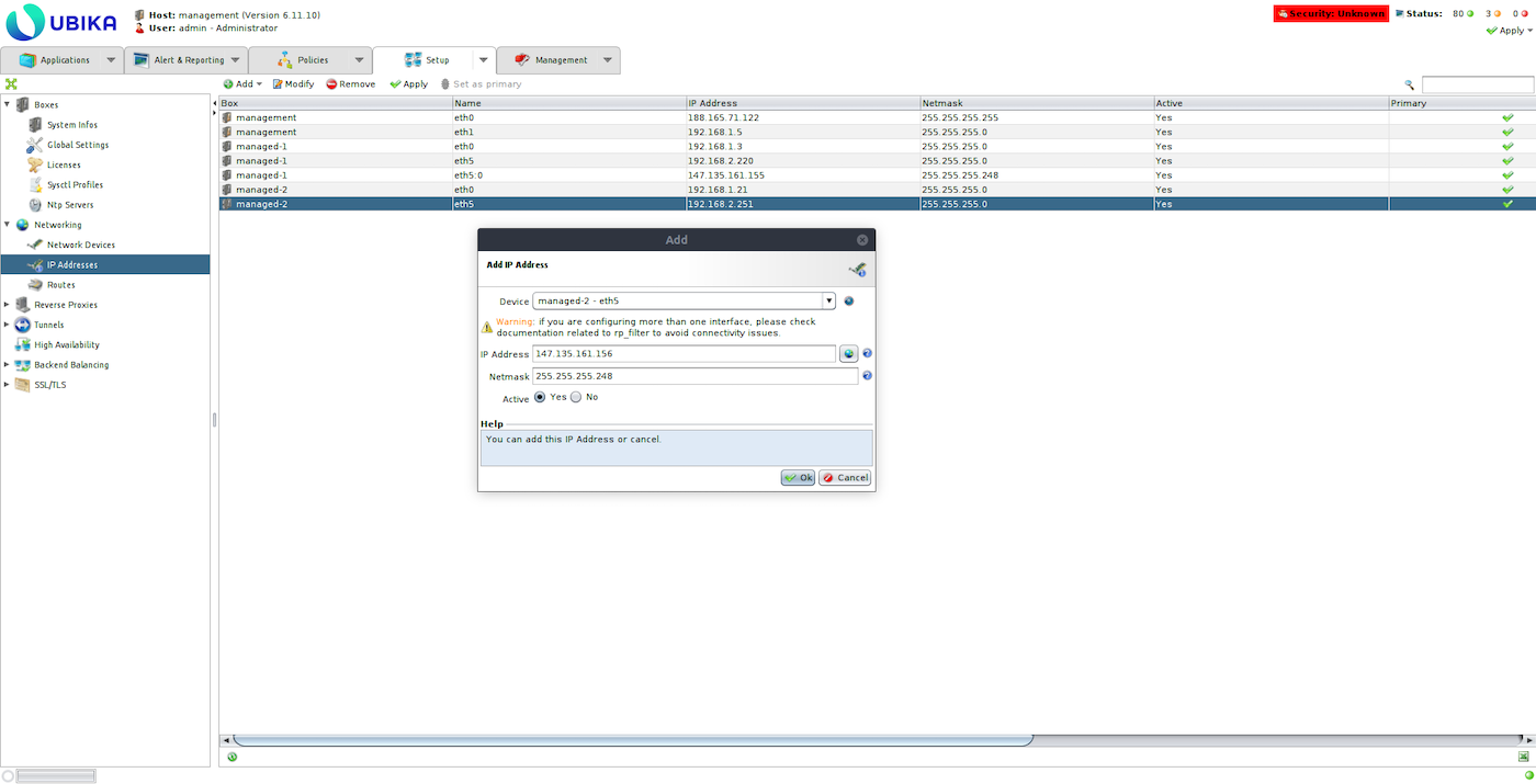 Fügen Sie dem eth1 Interface jeder verwalteten UWG Instanz ein virtuelles Interface hinzu und konfigurieren Sie es mit einer IP Ihres IP-Blocks anstelle der privaten IP (Setup > Networking > IP Addresses).
