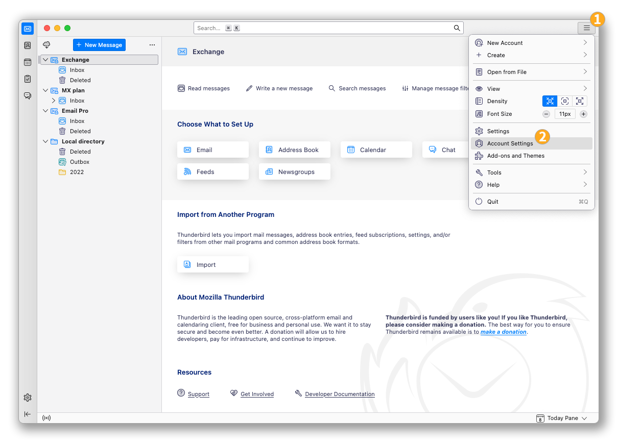 E-Mail Pro Accounts können auf verschiedenen kompatiblen E-Mail-Programmen eingerichtet werden. Dies ermöglicht es Ihnen, Ihre E-Mail-Adresse von Ihrem bevorzugten Gerät aus zu nutzen. Thunderbird ist ein freier und kostenloser E-Mail-Client.