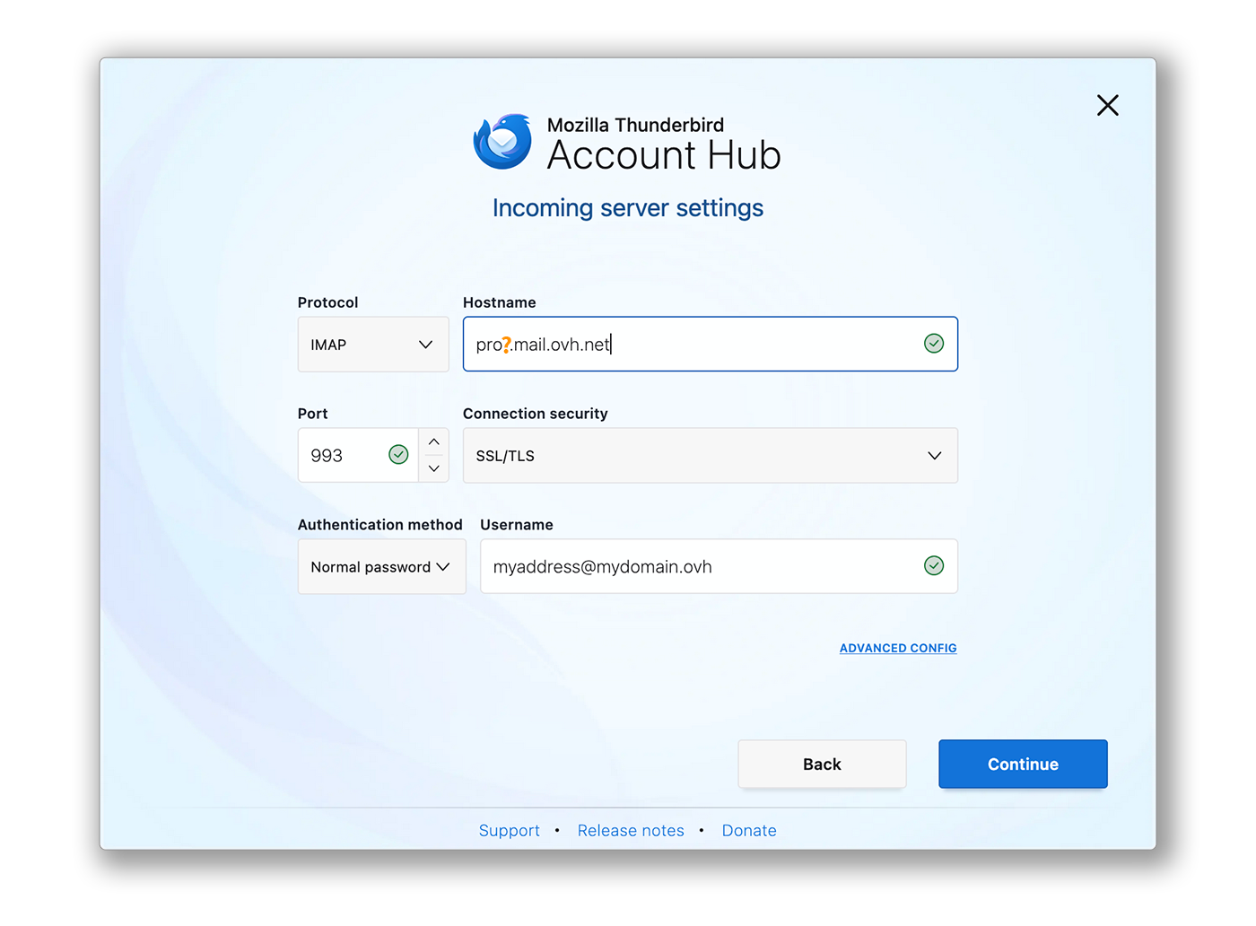Wenn Thunderbird einen OVHcloud Domainnamen erkennt, wird eine automatische Konfiguration für einen MX Plan Dienst vorgeschlagen. Klicken Sie auf KONFIGURATION ÄNDERN.