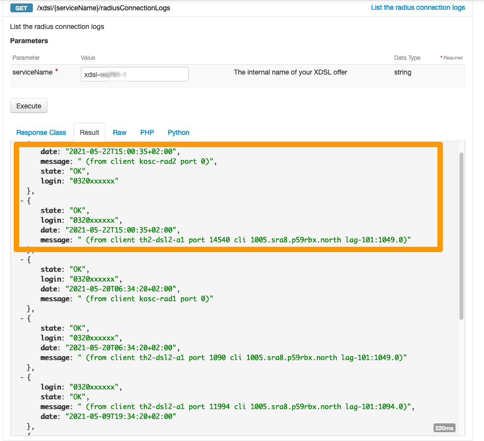 Saisissez, dans le champ serviceName, la référence de votre accès obtenue à l'étape précédente. Cliquez alors sur Execute.