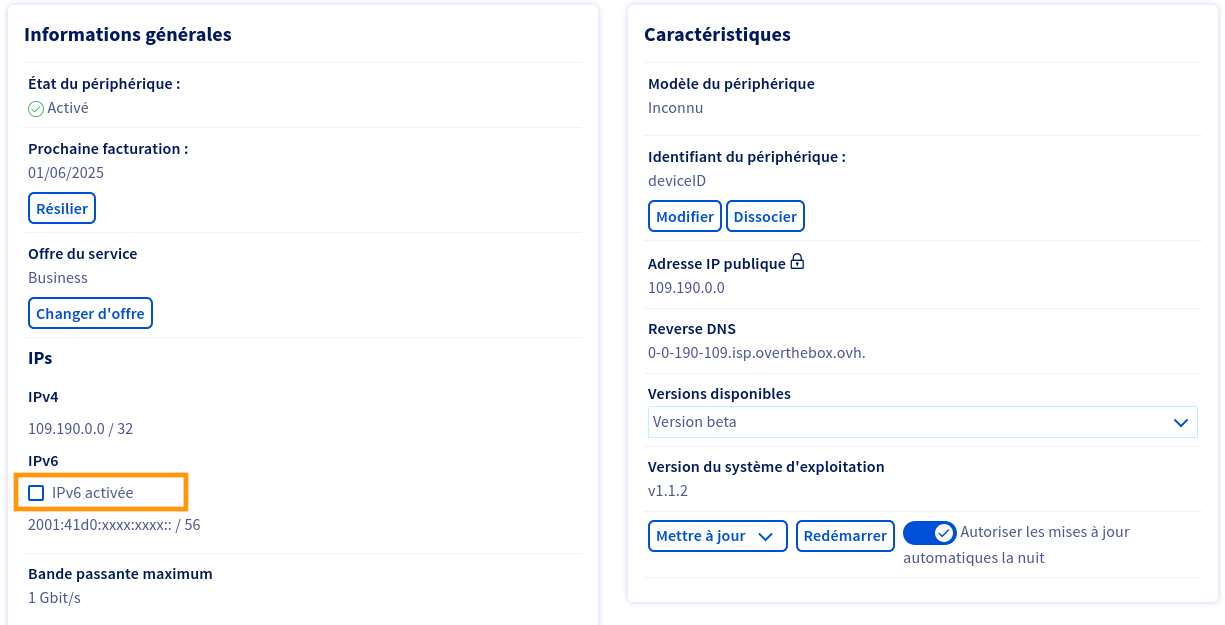 L'IPv6 est actuellement en phase bêta, le boîtier OverTheBox doit être en version v1.1.2 ou supérieure. Pour mettre à jour votre équipement, consultez le guide « Comment mettre à jour un appareil OverTheBox ».