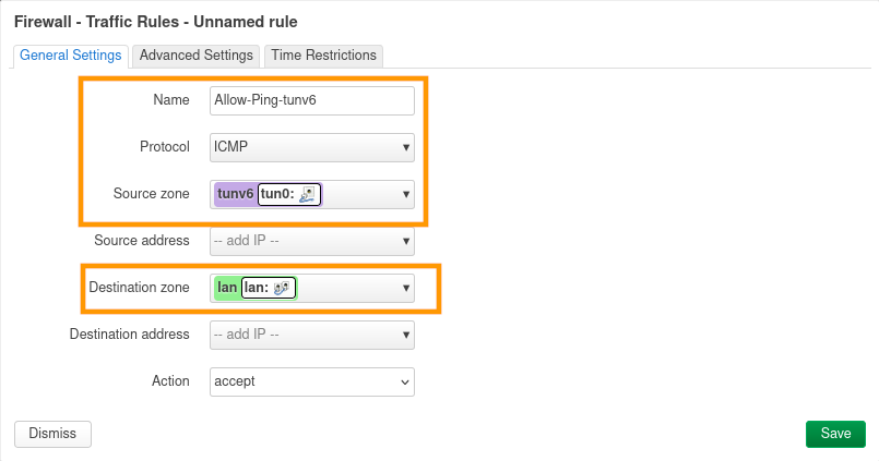 Modifiez le paramètre Source zone pour sélectionner la zone du pare-feu d'où proviennent les paquets. La zone est tunv6.