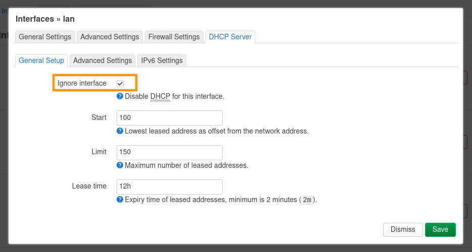Cochez le paramètre Ignore interface pour désactiver le serveur DHCP complètement.