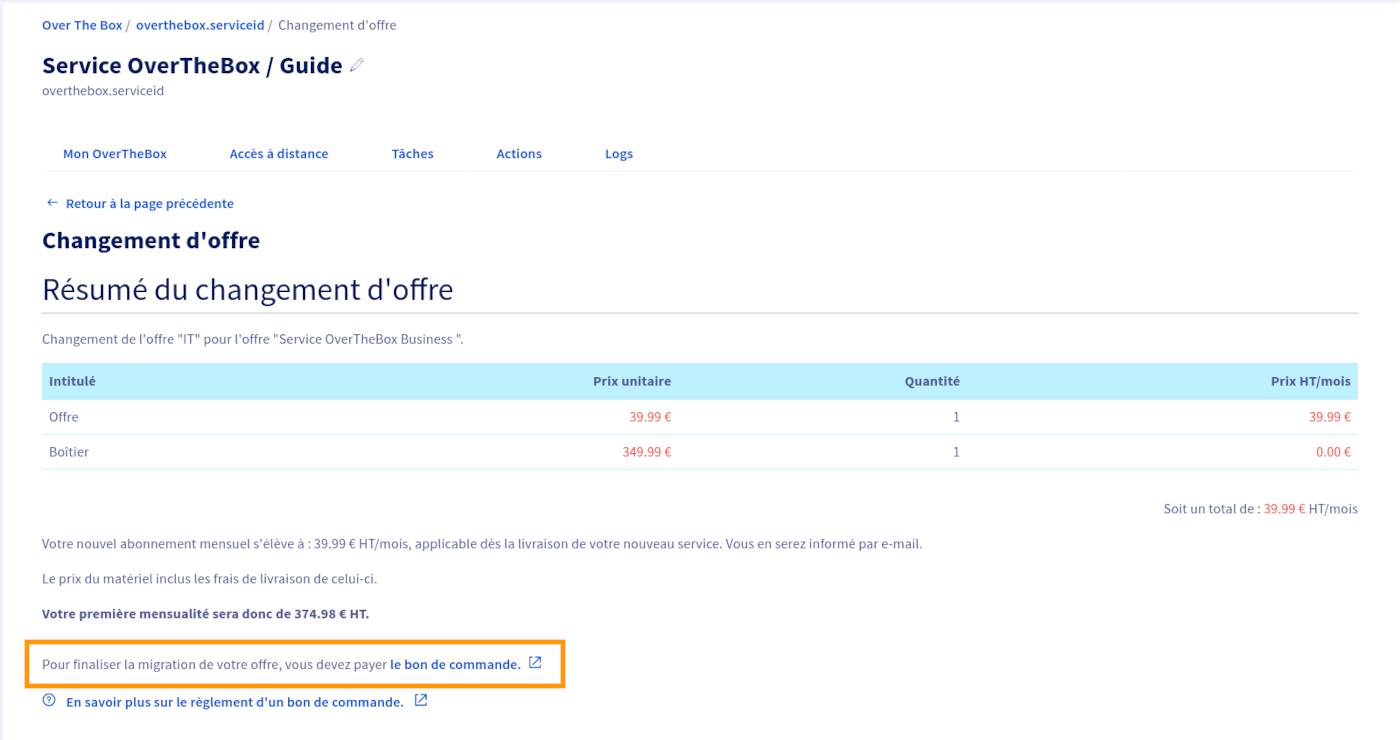 Pour finaliser le changement d'offre, ainsi que la livraison du boitier, vous devez payer le bon de commande généré lors de la confirmation de la migration.Pour ce faire, cliquez sur le lien contenu dans la phrase Pour finaliser la migration de votre offre, vous devez payer le bon de commande..