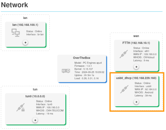 Que vous utilisiez une OverTheBox V3 LTE ou une autre méthode, l'équipement fournissant la connexion 4G attribue automatiquement une IP à l'OverTheBox. L'interface est donc automatiquement détectée par l'OverTheBox sans besoin d'intervention de votre part.