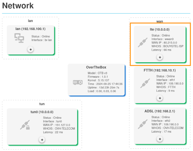 Grâce à un lien 4G, votre OverTheBox est capable de tirer parti des réseaux mobiles afin d'améliorer les performances ou la résilience de votre accès internet.