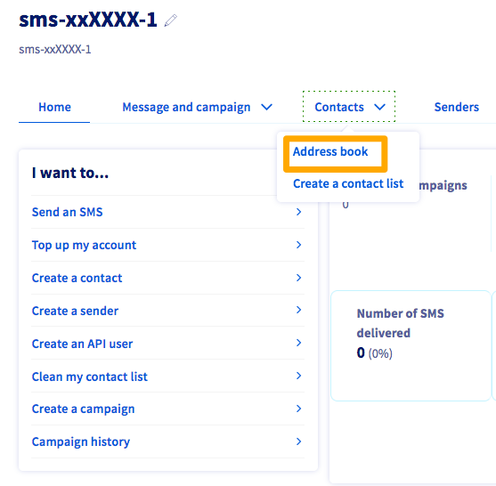 Click on the SMS account concerned, and select the Contacts tab, then Address book.