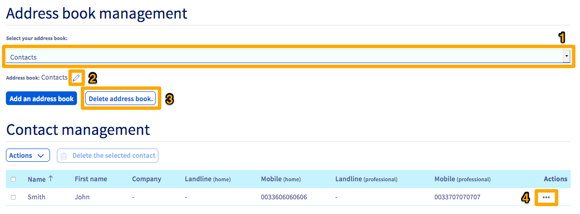 To edit or delete a contact, click ... in the Actions column (4) across from the contact concerned. You will then see a menu offering you these choices.