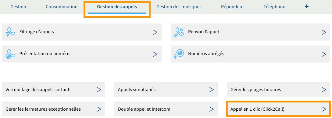 Positionnez-vous sur l'onglet Gestion des appels et cliquez sur Appel en 1 clic (Click2Call).