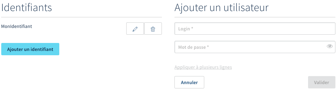 Si vous ne disposez pas d'un identifiant Click2Call : commencez par en créer un nouveau en cliquant sur Ajouter un identifiant. Renseignez alors l'identifiant que vous souhaitez ajouter puis définissez-lui un mot de passe en respectant les conditions qui apparaissent. Cliquez enfin sur Valider.