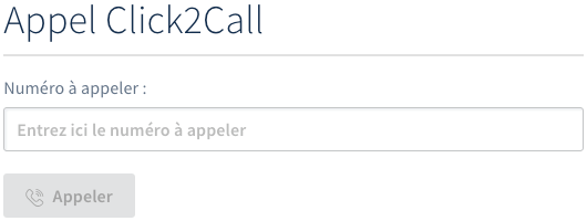 Si cela est nécessaire, l'interface de gestion de la fonctionnalité Click2Call vous permet de réaliser un appel de test vers le numéro de votre choix. Pour cela, dans la partie Appel Click2Call, renseignez le numéro dans la zone en dessous de « Numéro à appeler » puis cliquez sur Appeler.