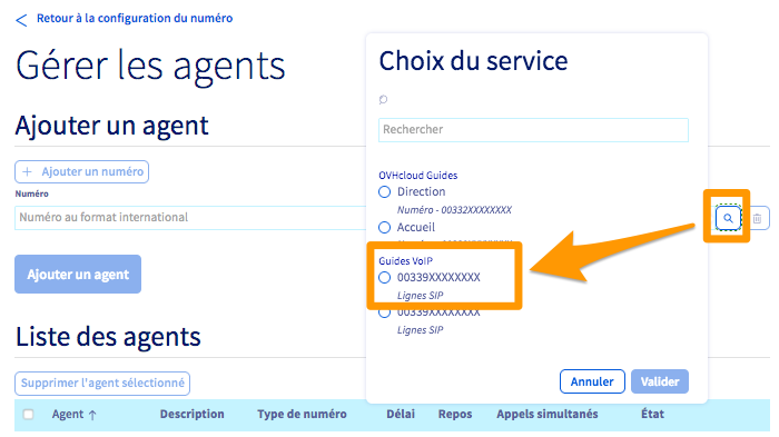 Afin de créer vos files d'appels, vous devez d'abord ajouter toutes les lignes qui pourront être contactées lorsque votre numéro alias sera appelé. Ces lignes sont ici désignées comme des agents.