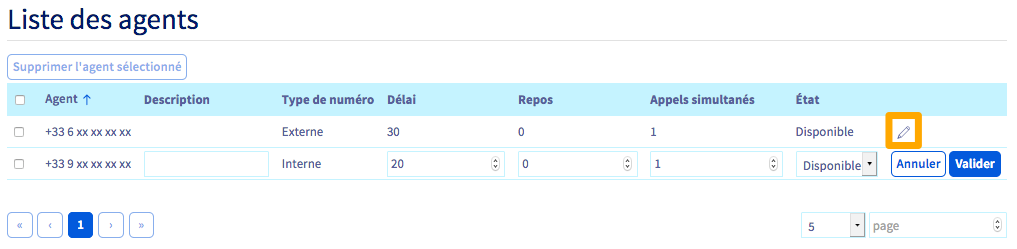 Les agents et leurs attributs sont visibles dans la « Liste des agents ». Vous pouvez modifier ces attributs en cliquant sur le stylo à droite de chaque agent.
