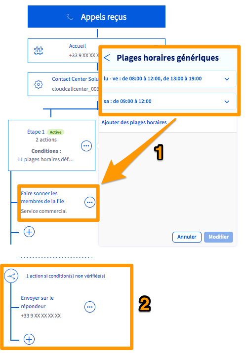 Ainsi, dans l'exemple ci-dessous, un appel pendant les plages horaires définies à l'étape 1 fera sonner les membres de la file d'appels nommée « Service commercial » (1).
