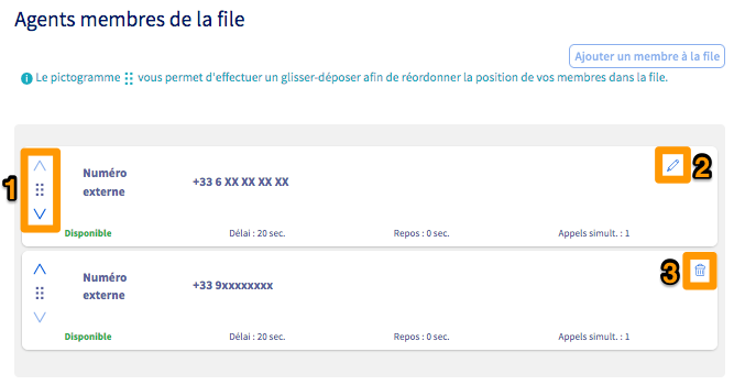 Vous pouvez modifier l'ordre des agents membres d'une file en effectuant un glisser-déposer via le pictogramme (1) à gauche de chaque agent. Dans le cas d'une stratégie d'appel « Selon l'ordre défini des membres », l'agent le plus haut dans la file sonnera le premier. Puis le deuxième agent sonnera et ainsi de suite.