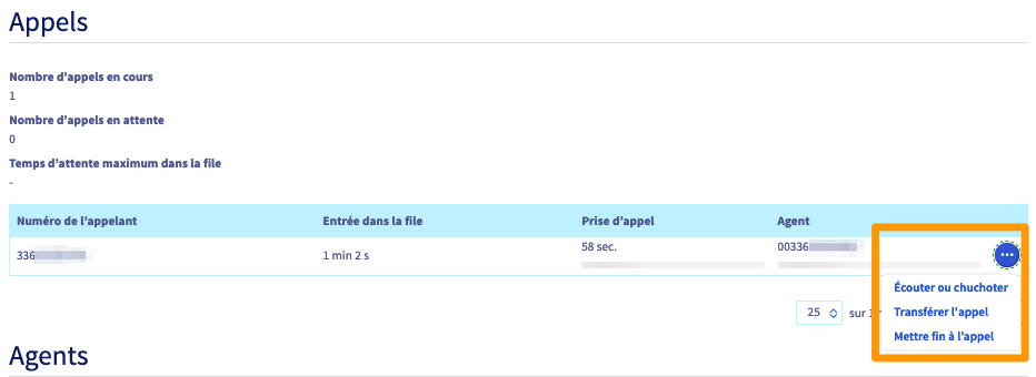 Le tableau de bord vous permet également d'interagir sur les appels en cours reçus par les membres de vos files d'appels.