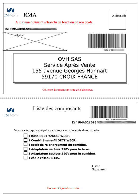 Adresse de retour : OVH SAS - 155, avenue Georges Hannart 59170 CROIX.