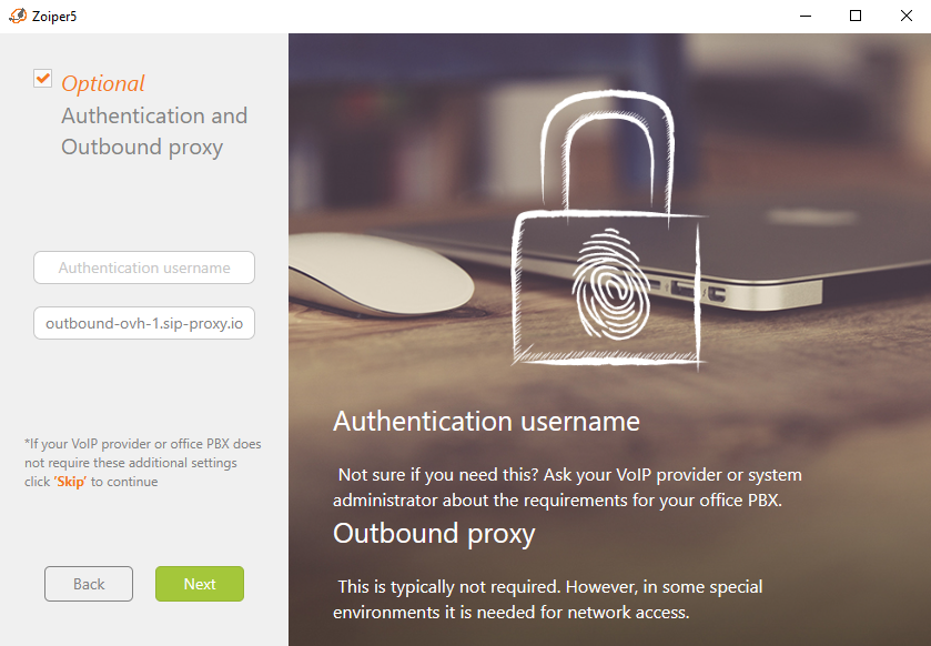L'assistant de configuration Zoiper vous propose alors de saisir un nom d'utilisateur d'authentification et un proxy sortant.