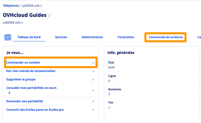 Que vous commandiez un nouveau numéro ou souhaitiez valider votre identité pour un numéro déjà en exploitation, cliquez sur l'onglet Commande de numéros ou sur Commander un numéro dans le menu « Je veux... ».