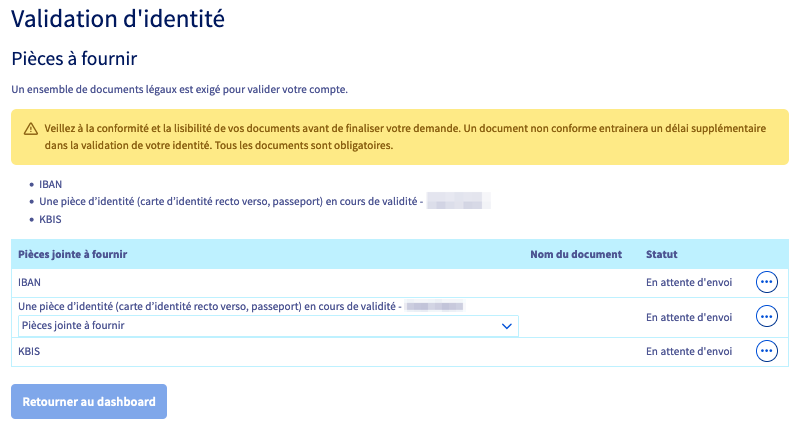 Dans le cadre de la réglementation européenne (notamment la lutte contre le blanchiment d'argent et le financement du terrorisme), Lemonway est tenu de vérifier régulièrement l'identité des utilisateurs.