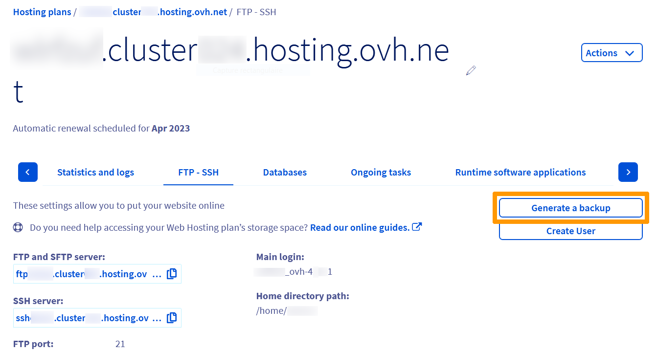 Im Gegensatz zu den Shared Hosting Paketen von OVHcloud ist es unmöglich, den FTP-Bereich mit einem Klick über das OVHcloud Kundencenter wiederherzustellen.