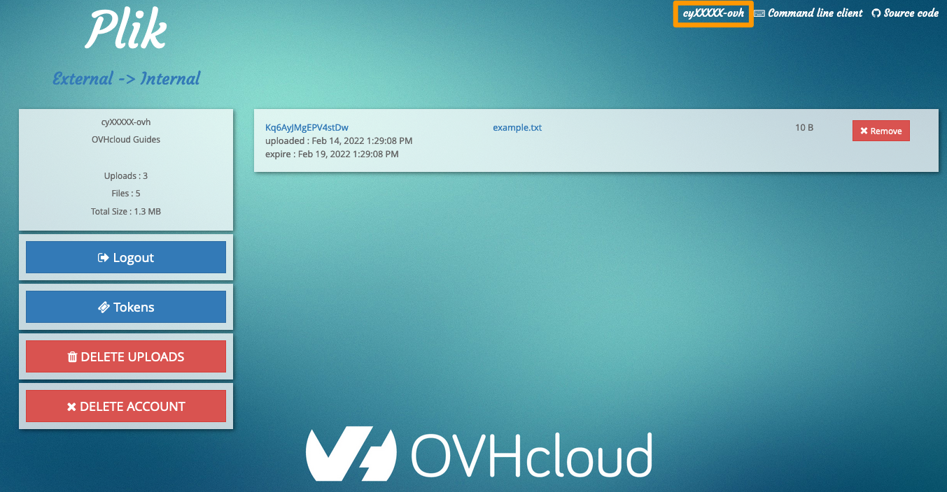 Using this menu, you can log out, generate tokens to use the Plik tool in the command line, delete each upload (via the Remove button to the right of each upload) or delete all uploads (via the DELETE UPLOADS button).