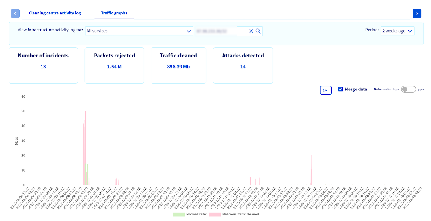 It presents malicious traffic that was dropped (in red) and clean traffic delivered to your IP address (in green). There are also basic mitigation statistics displayed, i.e.: how many attacks were detected for a selected IP, how much traffic (or packets) was cleaned during attacks or how many times scrubbing centres took an action to inspect your traffic (number of events) in a selected period of time.