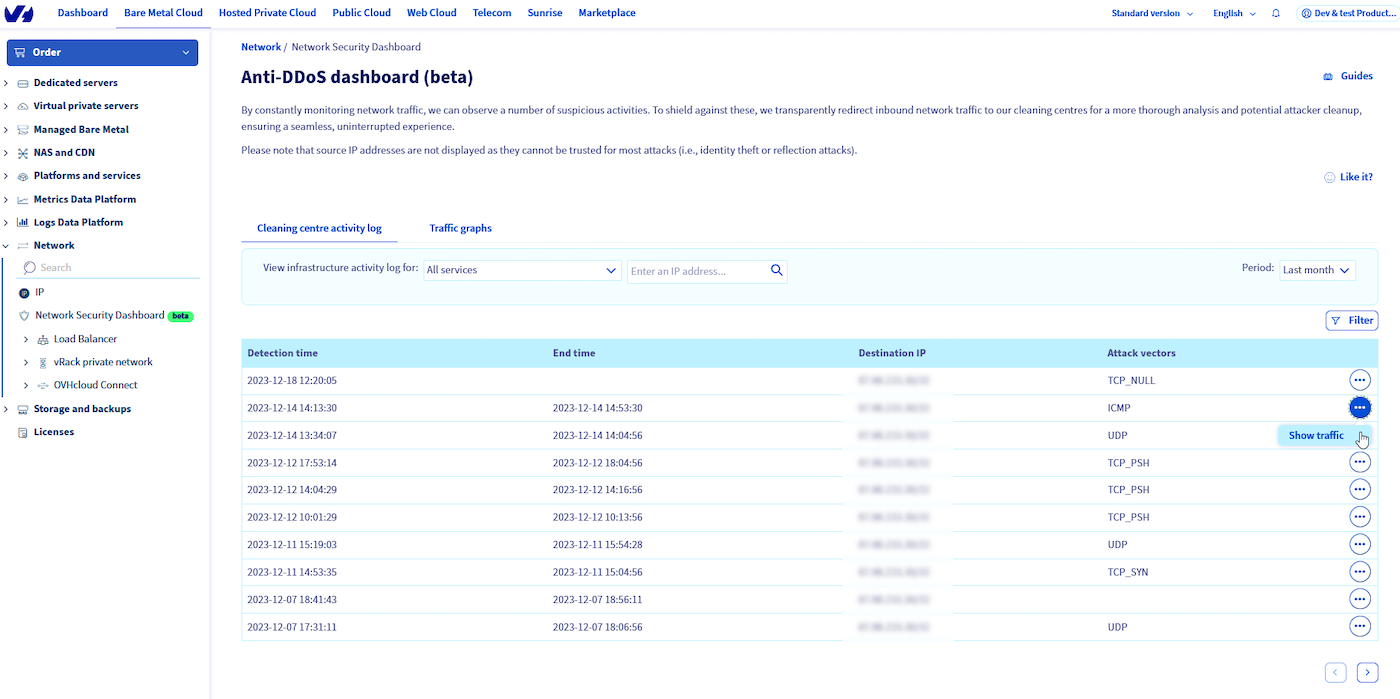 This guide explains the Network Security Dashboard and provides an overview of counter measures triggered by our DDoS protection infrastructure when malicious network activity is detected. You can find details on which additional protections should be implemented to keep your services up and running. Moreover, traffic charts are available on the dashboard for scrubbing centre activity periods to better visualize the situation.